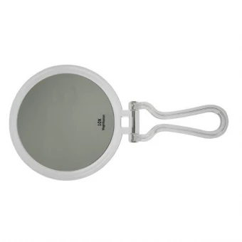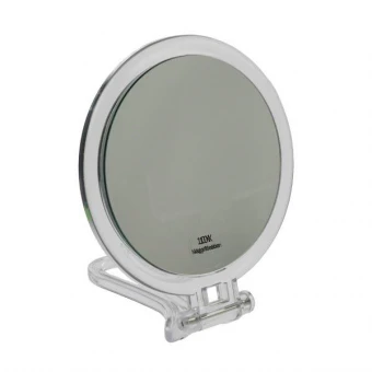 Reise-Stand- und Handspiegel aus Acryl im schwarzem Etui mit 10-fach-Vergrößerung. Ø 16 cm, Höhe stehend: 19 cm, Länge ausgeklappt: 29,5 cm.