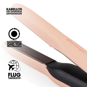 ghd unpluggedTM: ghd präsentiert ghd‘s kabellosen Styler für Styling on the go. Glatteres und geschmeidigeres Haar – überall und zu jeder Zeit. Die einzigartige Kombination aus Dual-ZoneTM Heizplatten und fortschrittlichem Lithium-Ionen-Akku ermöglicht bis zu 20 Minuten unvergleichbarer ghd Styling-Performance.** Mit seinem kompakten und leichtem Design ist der ghd unpluggedTM Styler der perfekte Begleiter für unterwegs. Mit USB-C Kabel und Stecker kann der Styler überall aufgeladen werden. Ein vollständiges Aufladen ist in weniger als 120 Minuten möglich bei Anschluss an eine Netzsteckdose.*** Zudem verfügt er über eine Intelligente 5-Balken Batterie-Lebensdaueranzeige und ist Handgepäckfreundlich.****