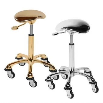 Metallic Ledersattel und hochverdichteter Schaumstoff für maximale Bequemlichkeit. Luxuriöses Aussehen mit verchromtem Fuß. Mit RollerCoaster hairproof Rädern und Chromschutzkappen. Höhenverstellbar von 45 bis 65 cm und einen Ø von 48 cm. Sattel: 29 x 29 x 7 cm.